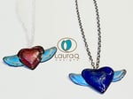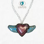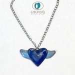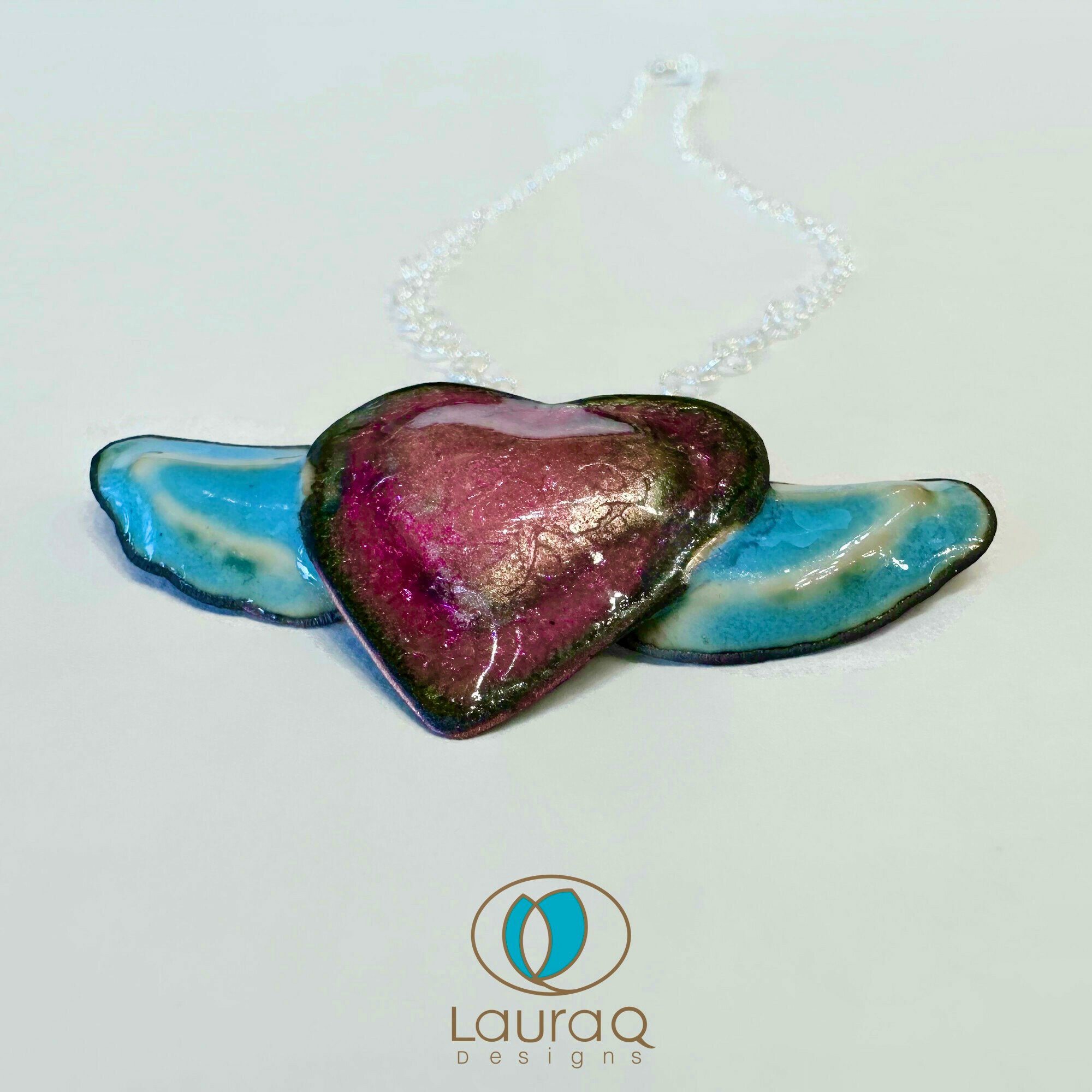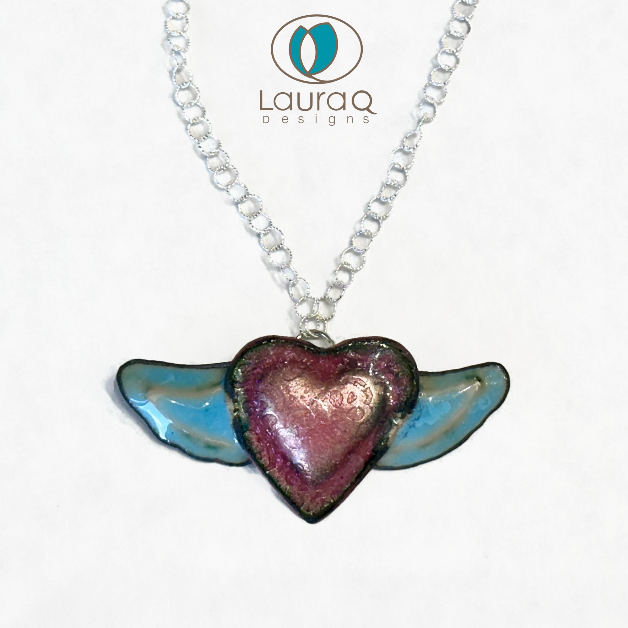 The sweetest necklace in two color choices !!! blue enamel and ruby red transparent enamels on copper with turquoise enameled wings. The heart is 1" wide (26mm) and the wing spans bring it to almost 2.5" (54mm) . It's 3 different pieces assembled together to create great dimensionality . The sterling silver chain is 18" long. The blue version has been oxidized to show more contrast.