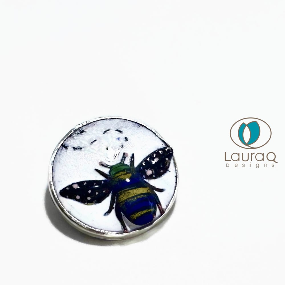 Buzzing bees created in vitreous enamel with amazing details and dimensions. Set on fine silver bezel and sterling silver. 1.5" round and 1/8" thick.