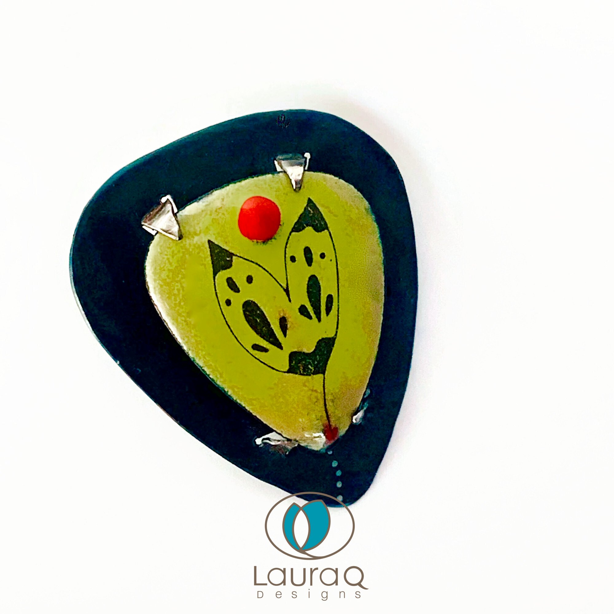 a Domed Petal shaped enamel brooch with an abstract flower design in chartreuse enamel with a stunning red glass dot on top. It all sits beautifully on soft steel with a dark patina. The beauty of it is that it can be a pendant, with a bail big enough for any chain or neck ring of your choosing. 1.75 inch long by 1.5 inches wide and .25 inches deep.