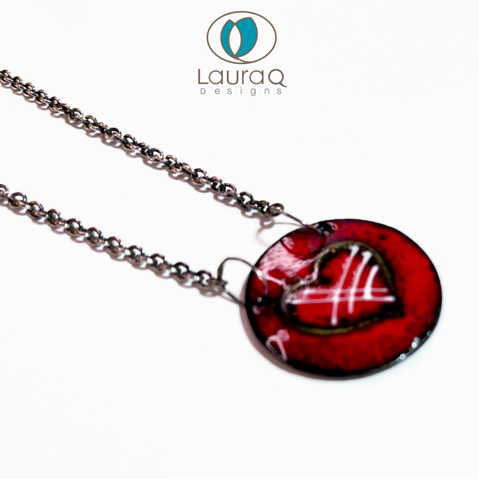 Can't have enough love for this beautiful necklace, there's two sides to enjoy. The raised red heart with white stripes and the back with a lovely pink background and a simple heart outline . The pendant is 1.25" round and hangs 18" long in solo chain in sterling with a dark patina.